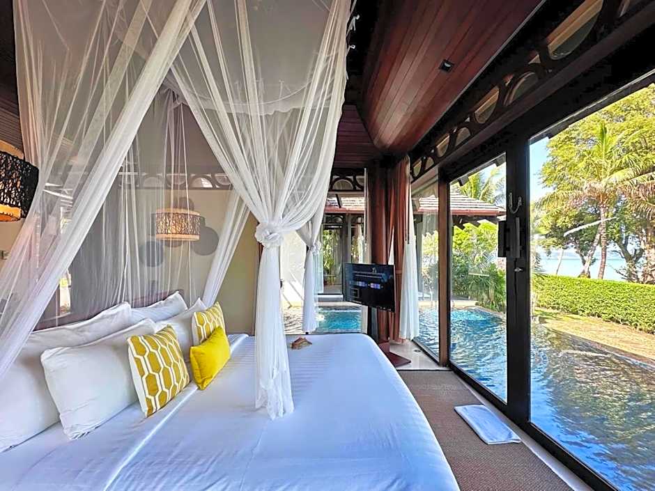 Beach front villa offers a private pool with sun loungers as well as outdoor rain shower and a bathtub.